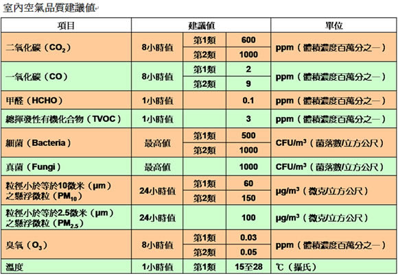 有的,環保署於94年12月30日公告「室內空氣品質(IAQ,Indoor Air Quality)建議值(如下表),該建議值內容包括二氧化碳(CO2)、一氧化碳(CO)、甲醛(HCHO)、總揮發性有機化合物(TVOC)、細菌(Bacteria)、真菌(Fungi)、粒徑小於10微米之懸浮微粒(PM10)、粒徑小於2.5微米之懸浮微粒(PM2.5)、臭氧(O3)及溫度等共10項,並根據民眾聚會特性分2類場所適用不同寬嚴程度數值,第1類係對於室內空氣品質有特別需求場所採用較嚴格數值,第2類則係指一般大眾聚集之公共場所及辦公大樓。