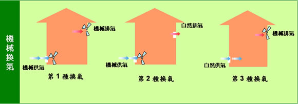 機械式換氣有三種模式,第一種是利用機械將室外空氣導入,同時也利用機械將室內空氣強制排出,在自然通風環境不佳或是欲達到一定換氣量的要求下,是最確實的作法;第二種則是利用機械將室外空氣導入,運用室內與室外的壓力差將室內空氣排出;第三種是運用機械將室內空氣排出,再利用室內與室外的壓力差將室外空氣導入。 運用機械式換氣設備全天24小時連續運轉,強制讓屋內汙濁空氣排出,並利用濾網將外面自然空氣過濾後導入,在無須打開門窗的需求下,住宅仍可以保持穩定的換氣量,有效降低室內污染值。 -