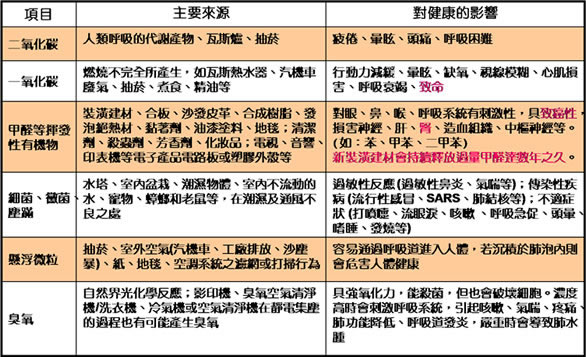 室內空氣汙染來源包括了建材、室內使用物品與居住者的行為,都會造成空氣汙染,環保署列出我們室內常見空氣汙染源 ,以及對健康所造成的不良影響: